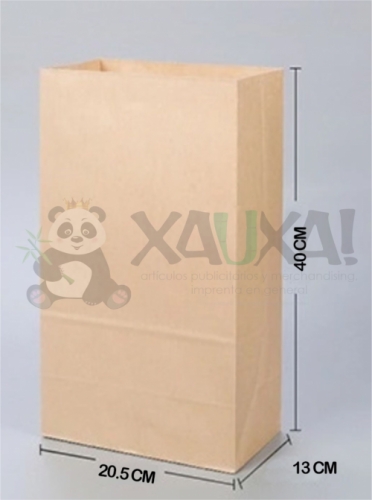 Bolsas de papel kraft de 60 grms, impresión 1 color, medidas 20.5 x 40 x 13 cm.